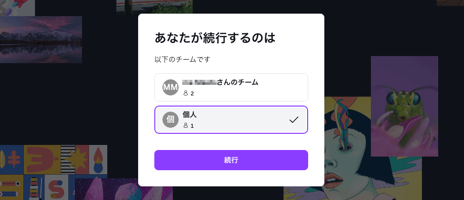 Canvaのチームが複数ある場合は、チームも選択して「続行」します。