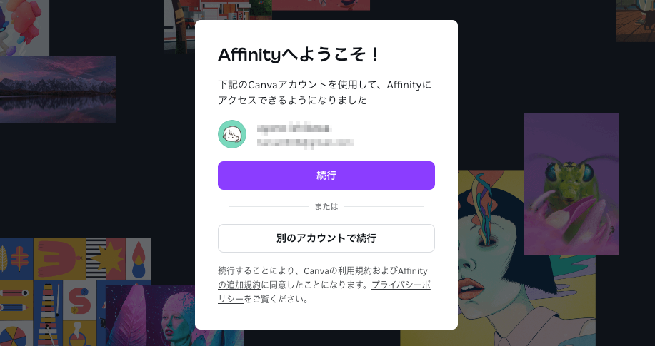 「Affinity へようこそ!」と表示されるので、登録するCanvaのアカウントを確認して「続行」をクリックします。