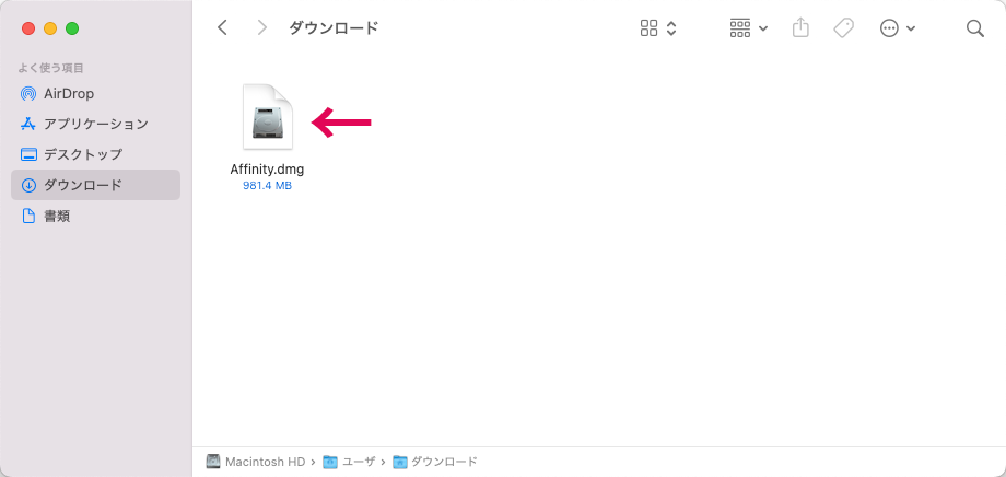 Finderからダウンロードした「Affinity .dmg」ファイルをダブルクリックで開きます。