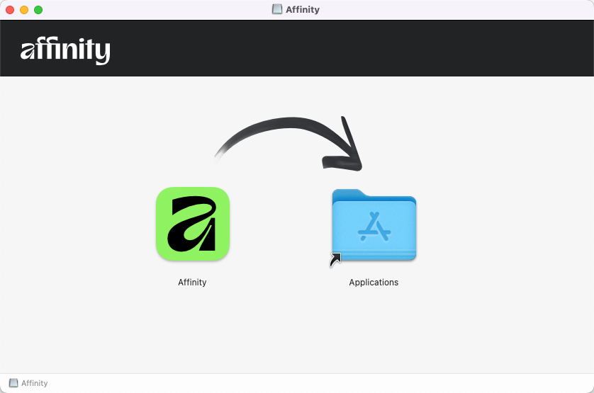 ダイアログが表示されるので、Affinityのアプリアイコンをアプリケーションのアイコンにドラッグ&ドロップでインストールします。