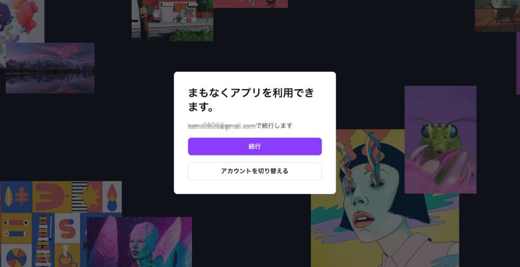 AffinityにログインするCanvaのアカウントを確認して「続行」をクリックします。