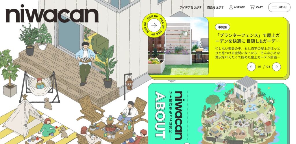 メインビジュアルのイラストにビビットなカラーがとってもオシャレなWebサイトです。ラインを活用したコンテンツの見せ方や、遊び心のある画像のトリミングにグッときます。