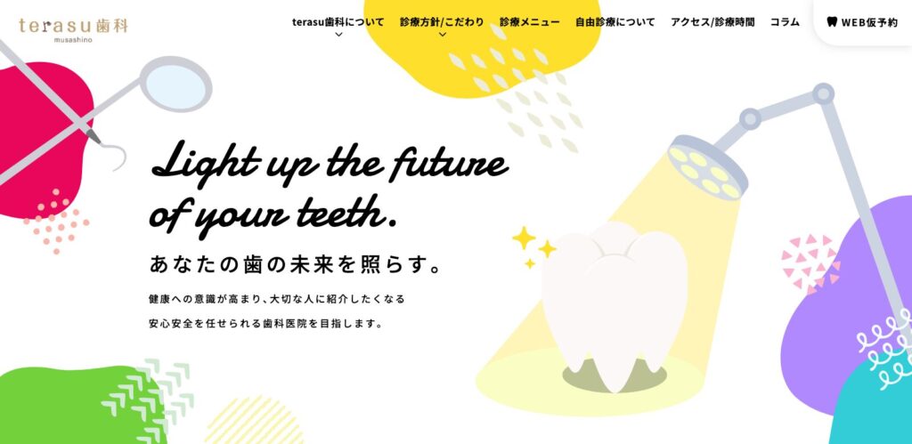 歯科医院のアイテムが、すっきりとした主線のないイラストで描かれたポップなデザインのWebサイトです。カラフルな背景に、するっと登場するイラストのアニメーションが素敵です。