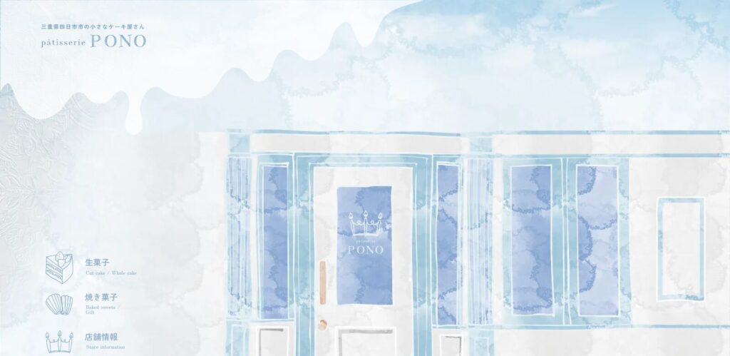 手書き感のある線画のイラストとブルーを基調とした水彩テクスチャのかかったメインビジュアルが素敵なWebサイトです。クリーム状にトリミングされた画像や背景の境が、スイーツのイメージにぴったりです。