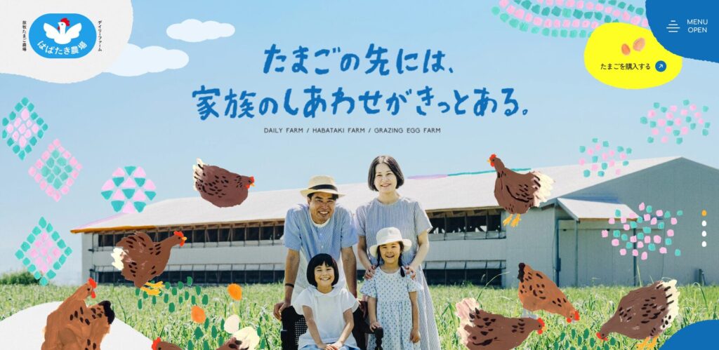 絵の具の質感が残るニワトリのイラストが可愛いWebサイトです。手書き感のある背景やイラストに、卵形の画像のトリミングが可愛いです。