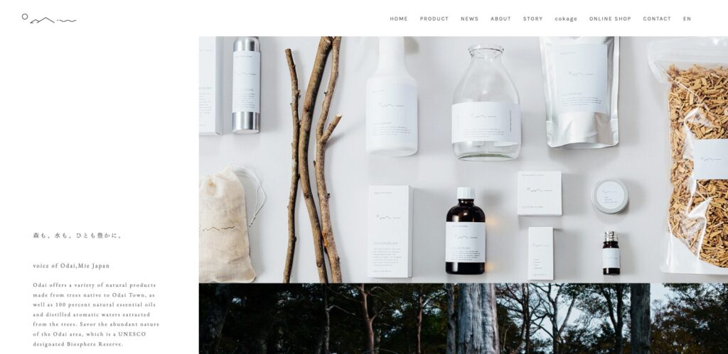 白背景に美しいプロダクト写真が映えるオシャレなWebデザインです。写真と繊細な明朝体の組み合わせが洗練されており、商品の魅力を伝えてくれます。