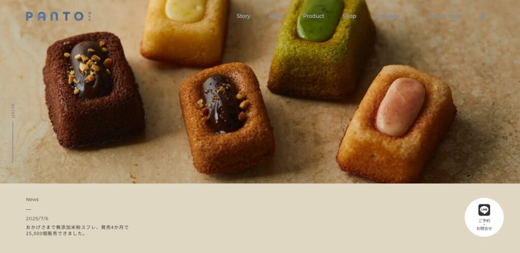 ベージュの背景に丸みのあるフォントがマッチしたWebデザインです。ふわっと浮き上がるようなアニメーションで表示される、美味しそうなパンと焼き菓子の写真に心惹かれます。