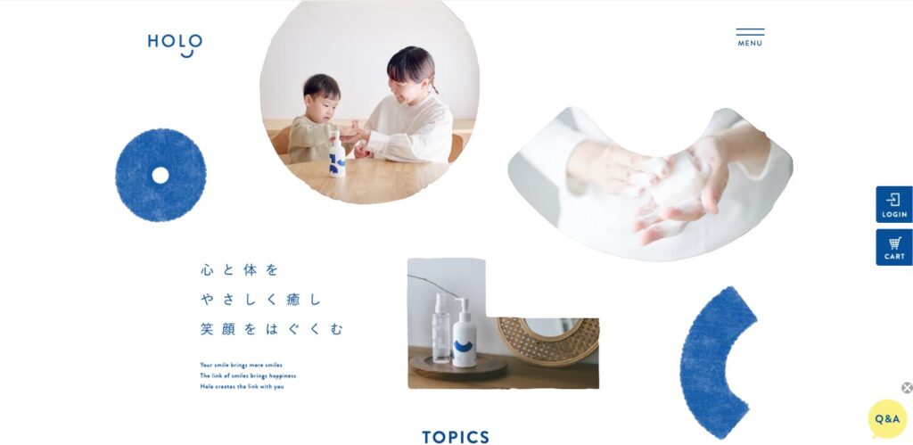 水彩風のあしらいに、トリミングの形も可愛い清潔感のあるWebデザインです。ライフスタイルに寄り添う落ち着いたトーンの背景に美しい青が映え、余白を贅沢に使った配置が素敵です。
