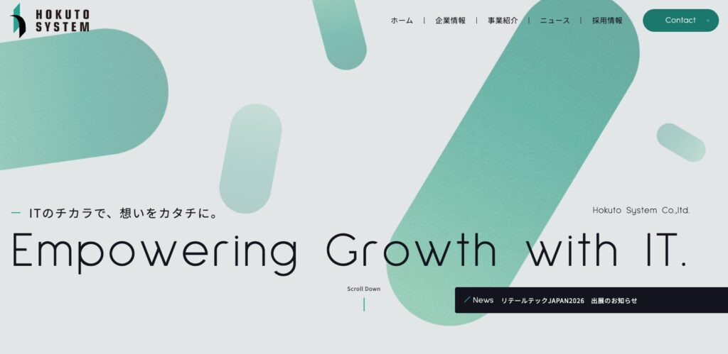視認性の高いゴシック体と、整ったグリッドレイアウトがスッキリとしたWebデザインです。奥行きのある要素がスクロールで流れるように現れる動きが、企業の先進性をスマートに演出しています。