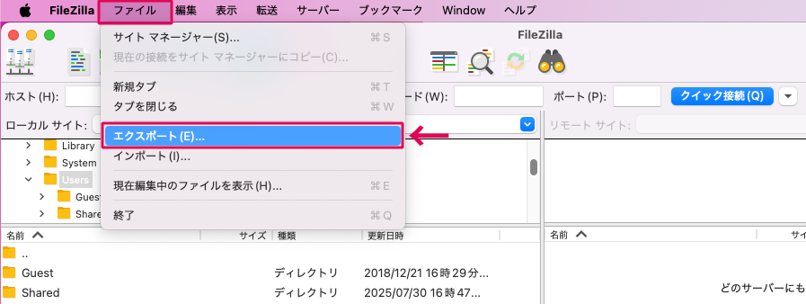 FileZillaを起動して上部メニューから「ファイル」>「エクスポート」を選択します。