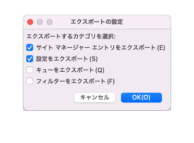 エクスポートの設定ダイアログが開くので、サイトマネージャー、設定など移行したいデータを選択して「OK」をクリックします。