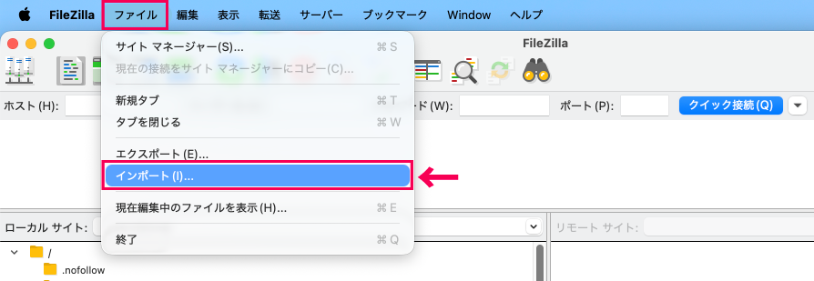 FileZillaを起動して上部メニューから「ファイル」>「インポート」を選択します。