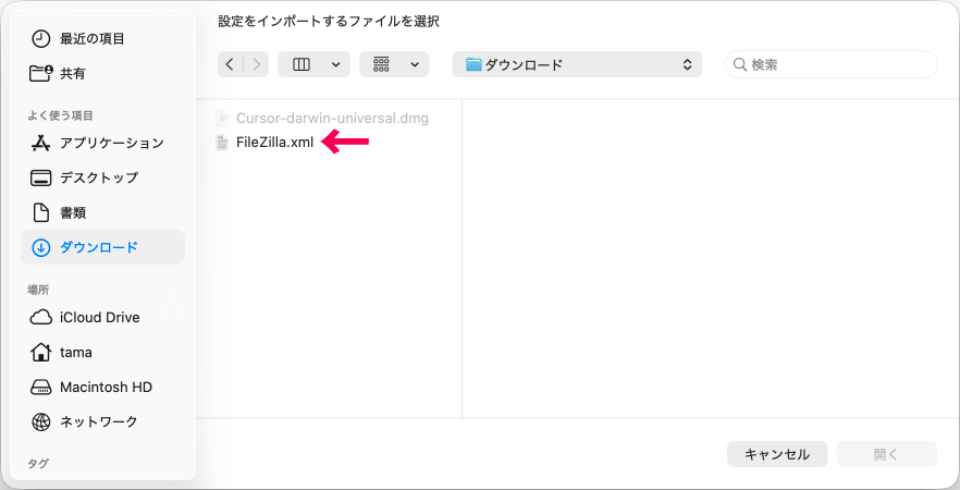 先ほど作成した「Filezilla.xml」ファイルを選択し、「開く」をクリックします。