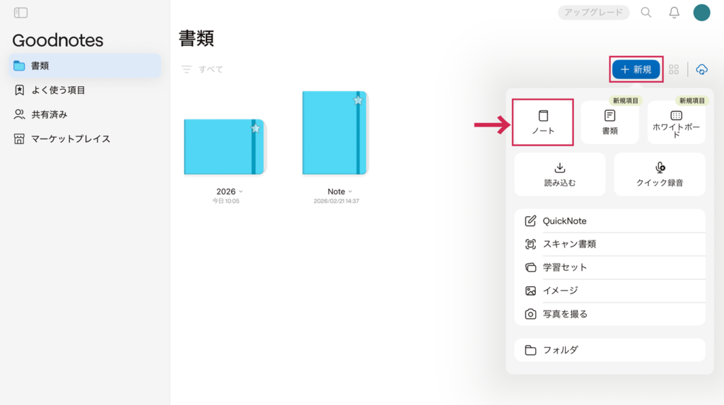 GoodNotes 6のホーム画面で、画面右上にある「新規」をタップして、「ノート」を選択します。