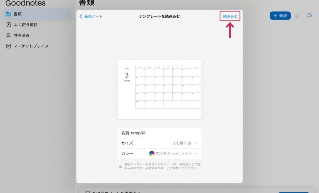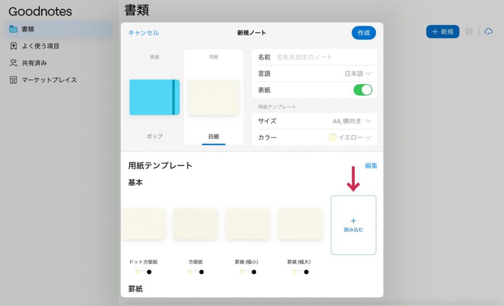 新規ノートの用紙テンプレート画面で、一番右側にある「読み込む」をタップします。
