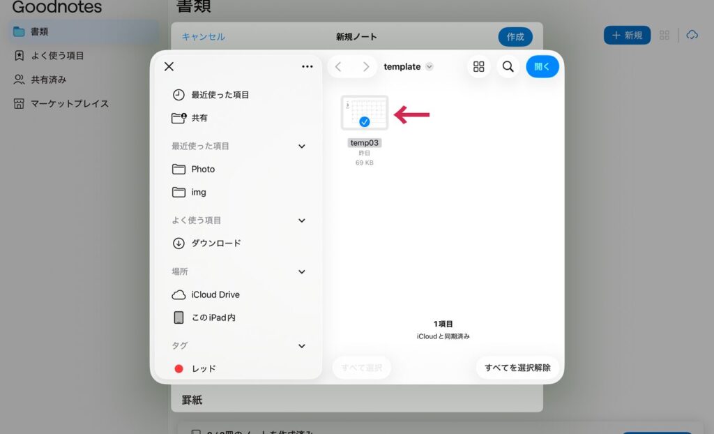 用意したテンプレートのPDFファイルを選択して、右上の「開く」をタップします。