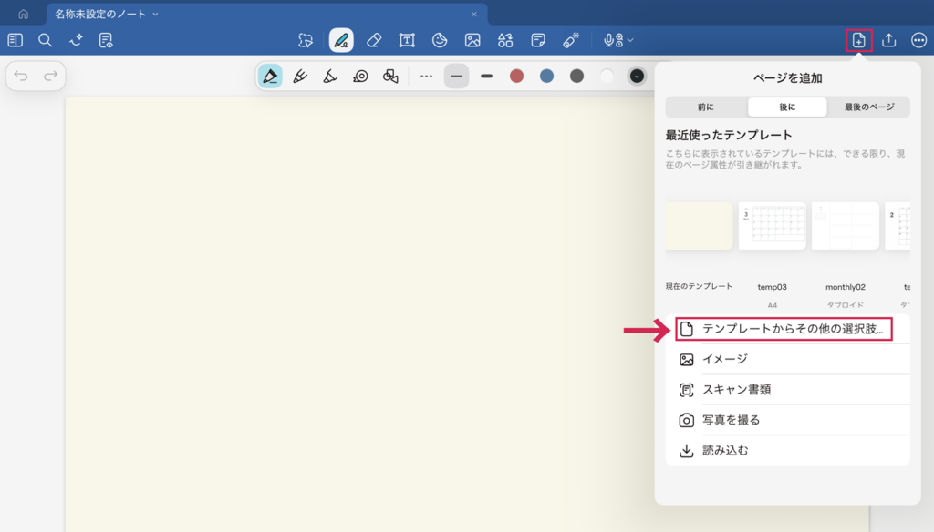 既存のノートで新しいテンプレートを使用したい場合は、右上の「+(プラス)」アイコンから追加できます。