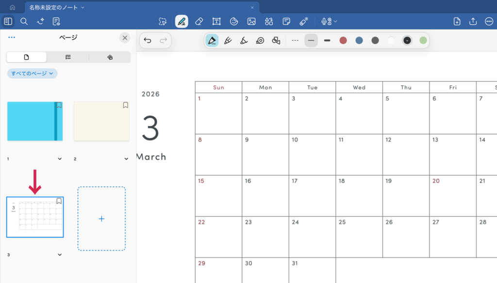 指定したテンプレートで、新規ノートのページが開きます。
