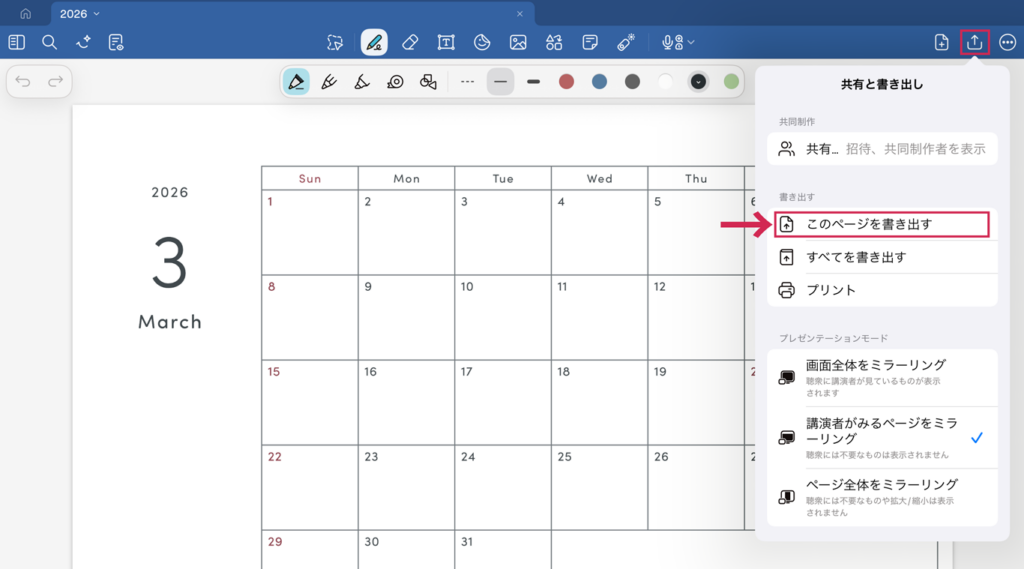 作成したページを開いた状態で、右上の「共有」アイコンをタップして「このページを書き出す」を選択します。