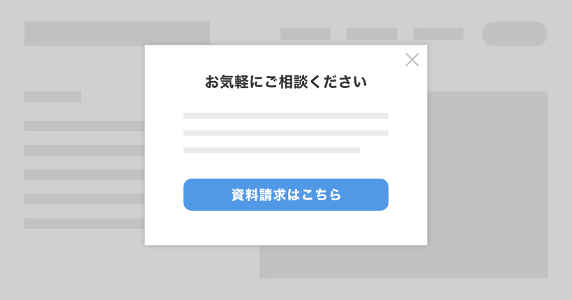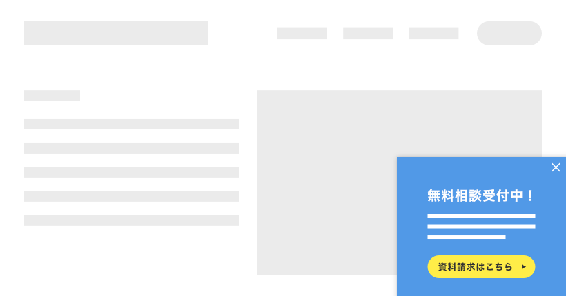 上記のサンプルでは、中央に表示したモーダルウィンドウの「資料請求はこちら」ボタンか、右上の「×」ボタンを押さない限り、元の画面をスクロールやクリックできない状態になります。