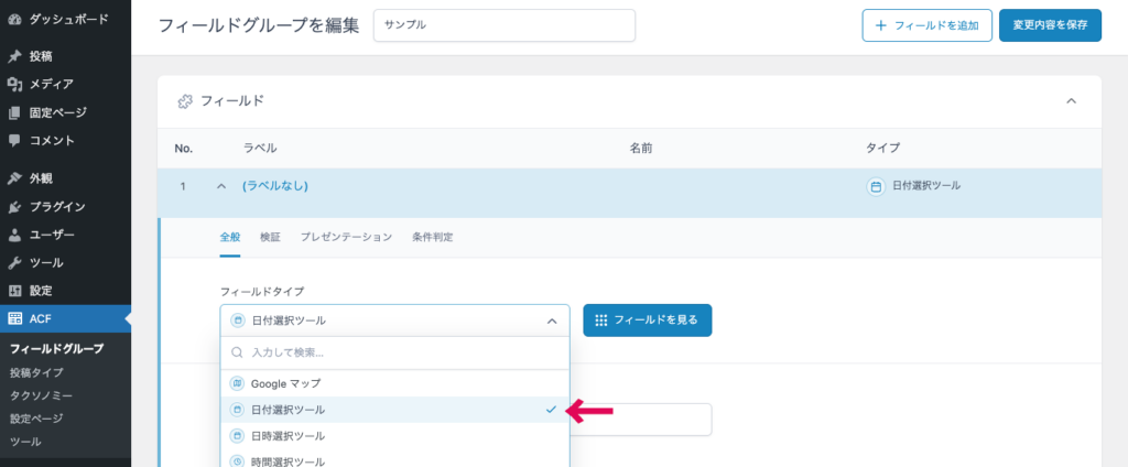 新規フィールドを作成し、フィールドタイプに「日付選択ツール」を選択します。