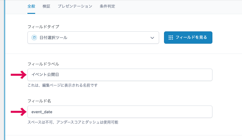 フィールドラベルとフィールド名を入力して、日付フィールドの完成です。