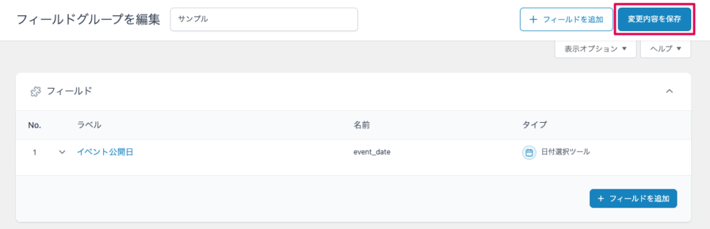 右上の「変更内容を保存」をクリックしてフィールドを保存します。
