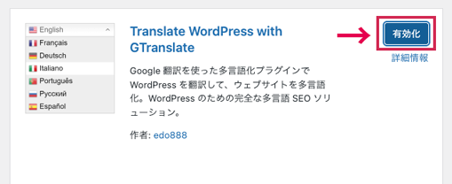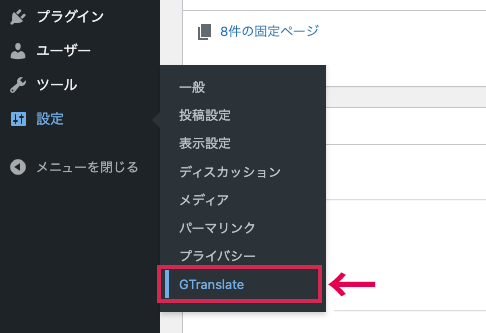 有効化して、「設定」に「GTranslate」が追加されたら準備は完了です。