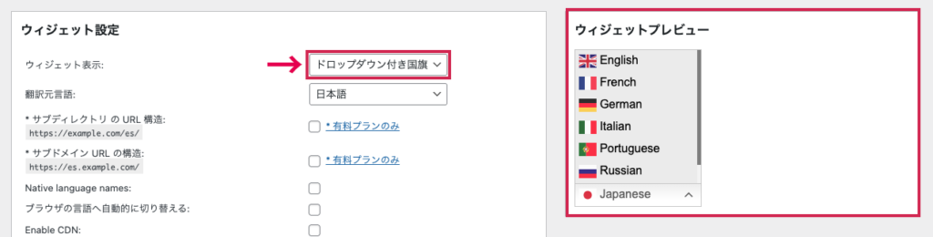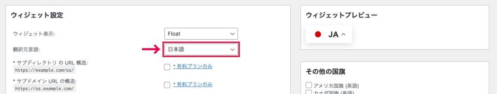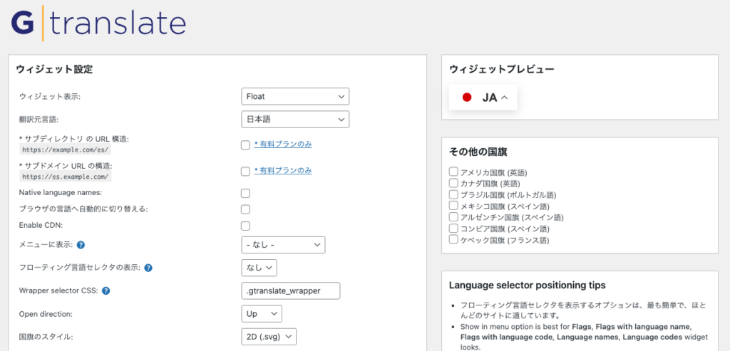 インストール完了後、管理画面の「設定」>「GTranslate」から詳細な設定を行います。