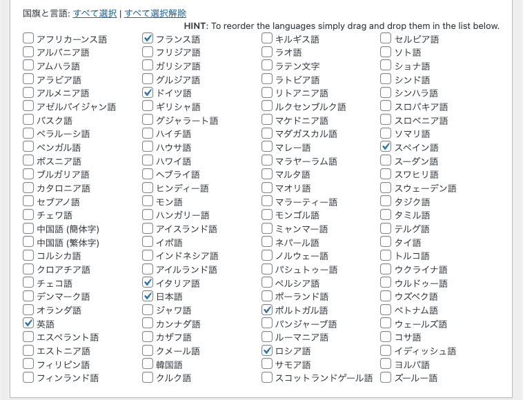 国旗と言語では、国名の一覧から翻訳対象にする言語を選択します。