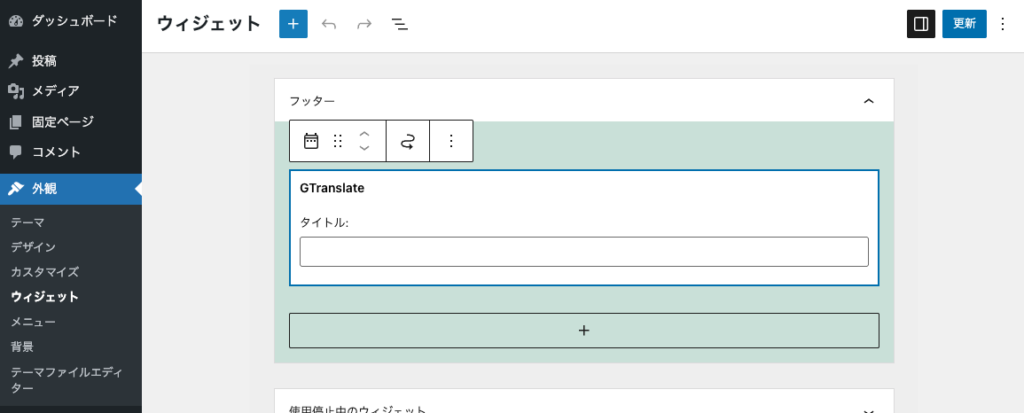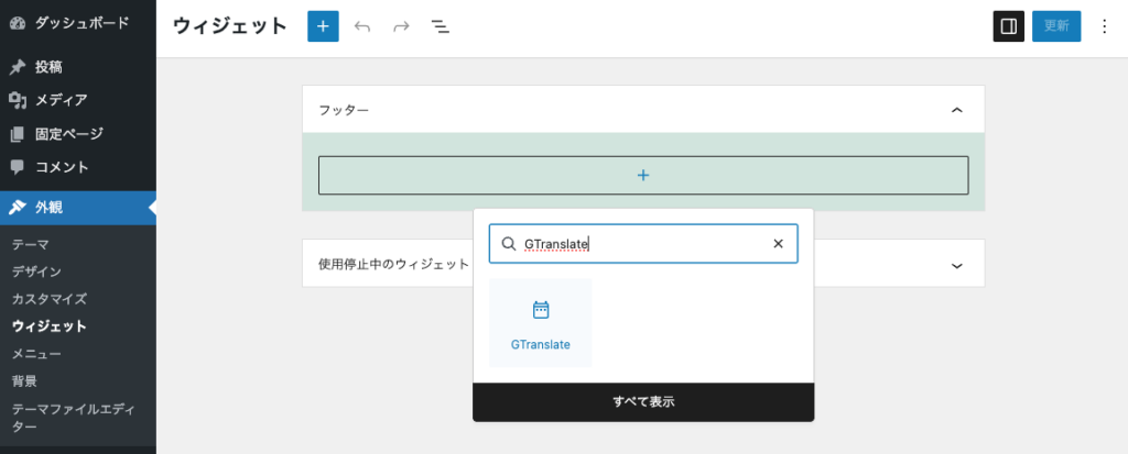「外観」>「ウィジェット」から、配置したいエリアに「GTranslate」ブロックを追加して保存します。
