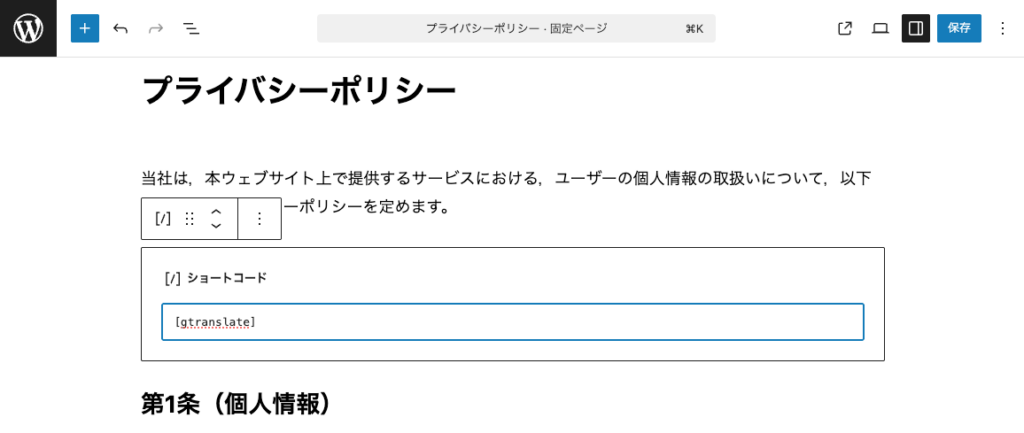 固定ページや投稿内で任意の場所に設置したい場合は、ショートコードブロックに以下のコードを入力します。