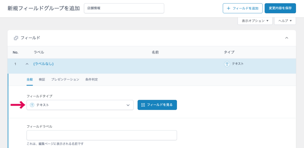 フィールドラベル:管理画面で表示する入力項目の名称です。日本語でも大丈夫です。