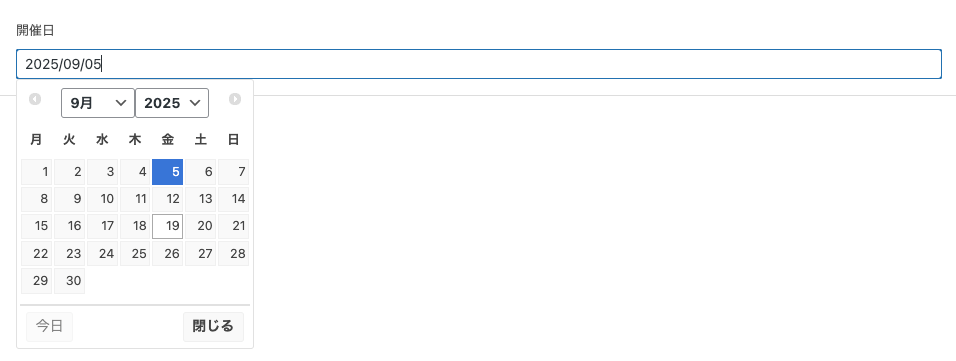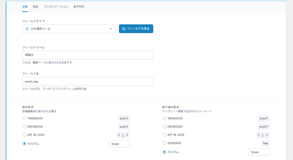 ACFの「日付選択ツール」のフィールドタイプで、「開催日」を作成しています。